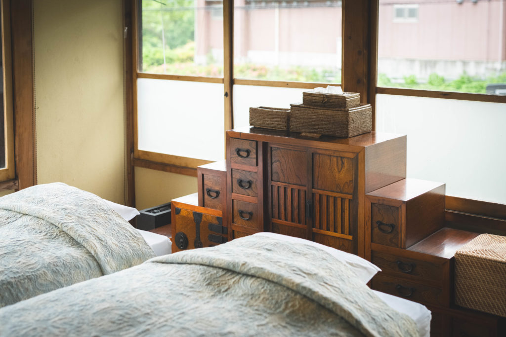 For guests planning to visit the nearby hot spring at Ashiwada Hotel, a convenient dedicated basket is provided. Simply place your towels and change of clothes inside and head out with ease. Samue loungewear is also available in the guest room, perfect for relaxing after a hot spring visit or enjoying a peaceful moment indoors.