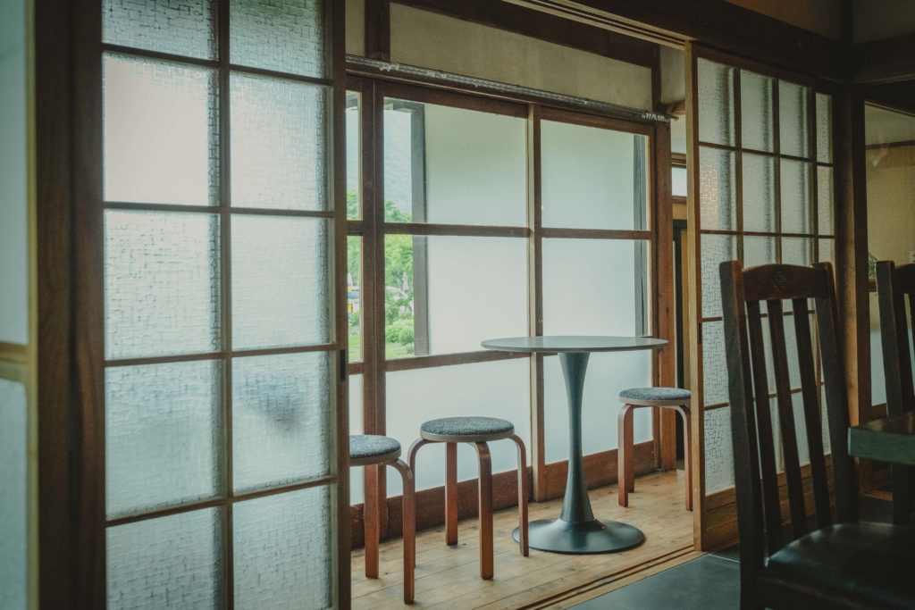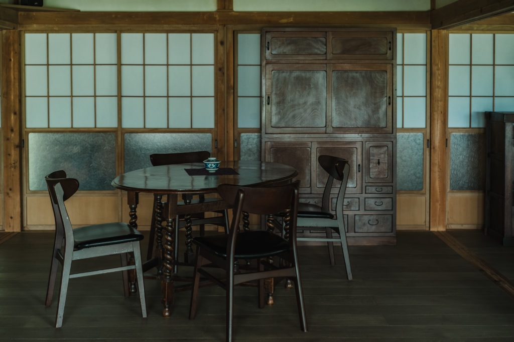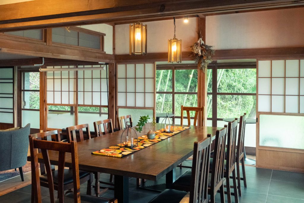 A large dining table and a spacious, comfortable living area make it ideal for group stays, allowing guests to relax and gather with ease. Bathed in soft natural light filtered through shoji screens and surrounded by greenery outside the windows, this space harmoniously blends the character of a traditional Japanese home with modern comfort—an inviting setting to enjoy moments of calm and quiet.