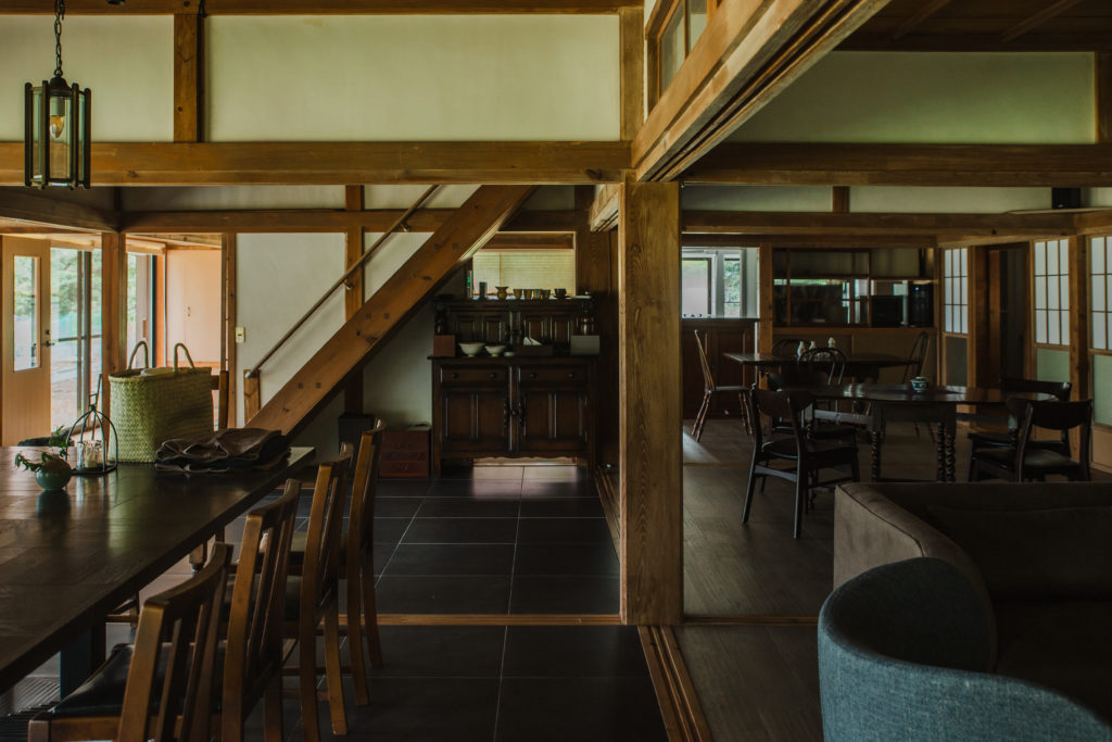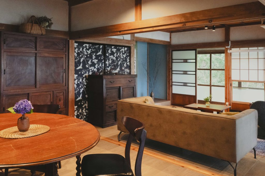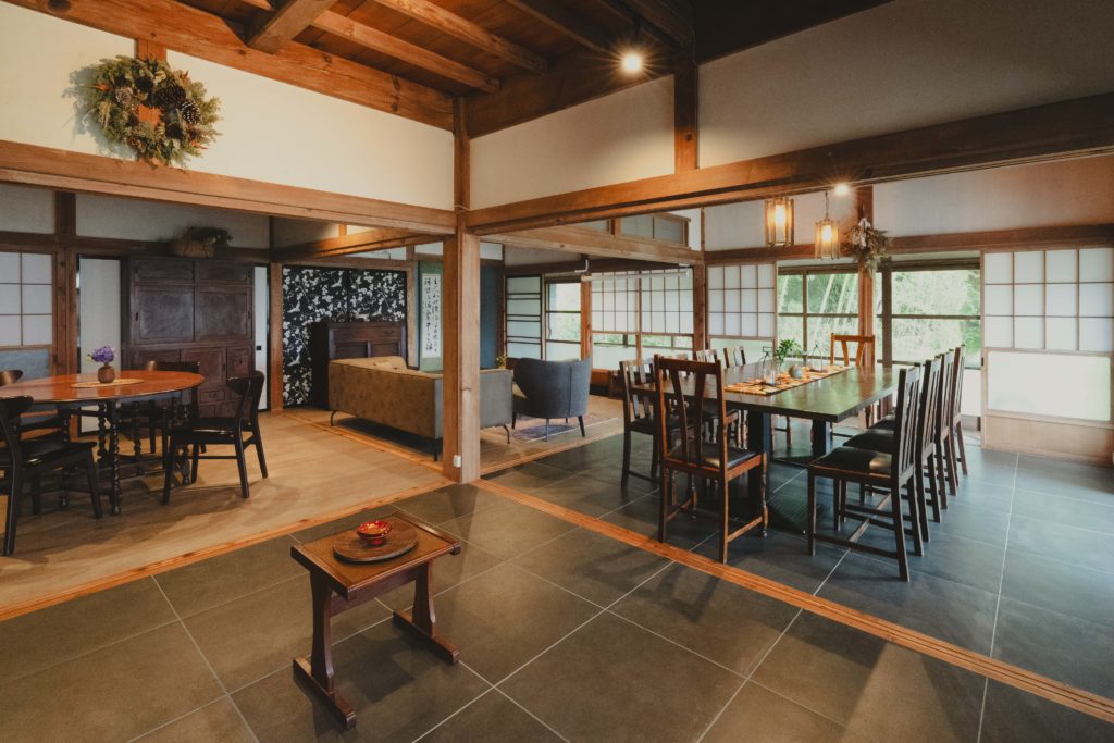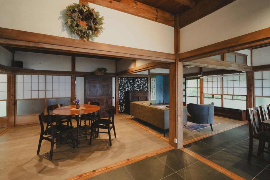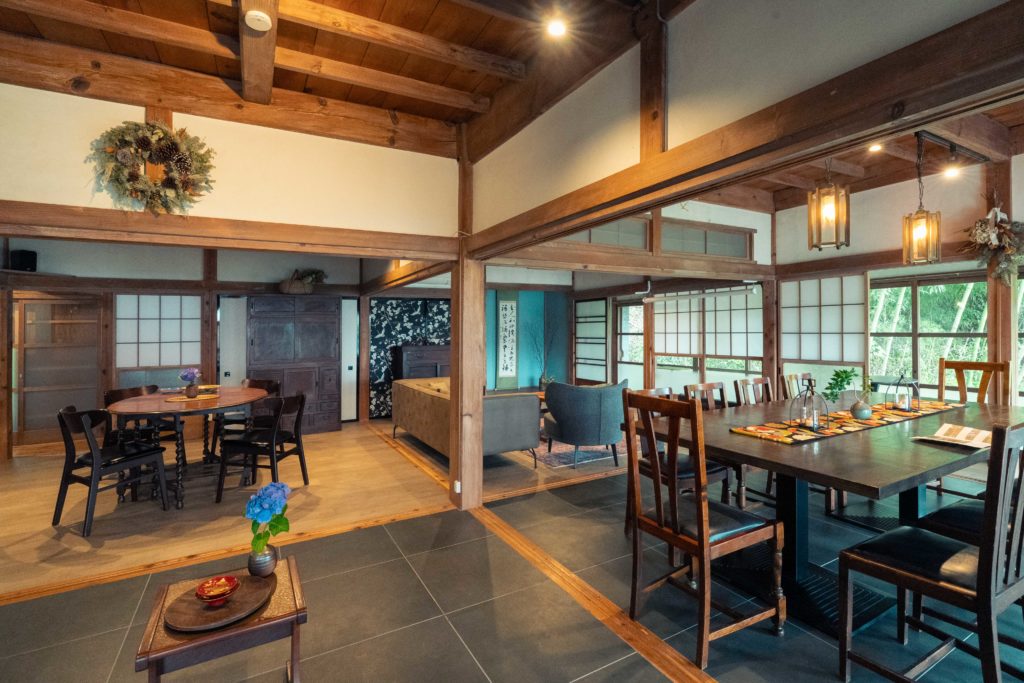The living and dining area showcases the distinctive charm of a traditional Japanese kominka, highlighted by sturdy wooden beams and high ceilings.